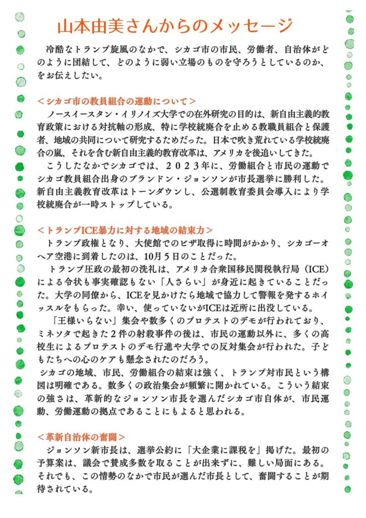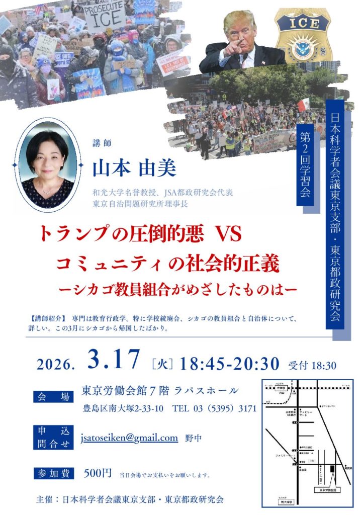アメリカ、シカゴの教職員、労働者や自治体が団結し、トランプの暴政をはね返した壮大かつ強固な市民運動について、「日本科学者会議東京支部・東京都政研究会」が報告します。