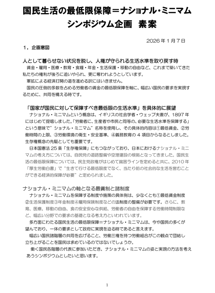1/7(木)、労研の事務協会議がスタートしました。「人として暮らせない状況を脱し、人権が守られる生活水準をとり戻す」ためには、全国一律最低賃金制を軸にしたナショナル・ミニマムの要求が不可欠であることを、労研の研究者の皆様と共に再確認しました。アメリカトランプ政権による「大資本と国家権力」に物を言わせた社会民主主義への圧力、ベネズエラ侵攻により世界の人権が侵害されているなか、教育・医療・エネルギー・食の安心安全も大きく揺らいでいます。この事態を打開するには、労働組合が人権の守り手となって、農業従事者やフリーランスとも結束し、国民共同の要求へと拡大させることが重要です。