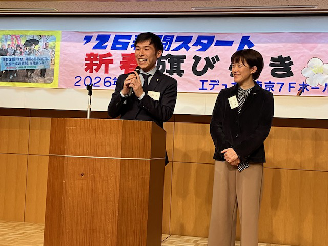 1/16(金)エデュカス東京にて「新春旗びらき」が行われ、70名以上が結集しました。開会挨拶で中央執行委員長の山田さんは「トランプのベネズエラ侵攻や高市政権の解散総選挙、権力が人権を踏みにじる中で、労働組合が希望となって春闘をたたかい抜く」と決意を表明、書記長の森さんは「物価高で皆が苦しい中、一人一人の要求を実現するテコとして、全国一律最賃を軸としたナショナル・ミニマムを推進する」と春闘方針を提起しました。